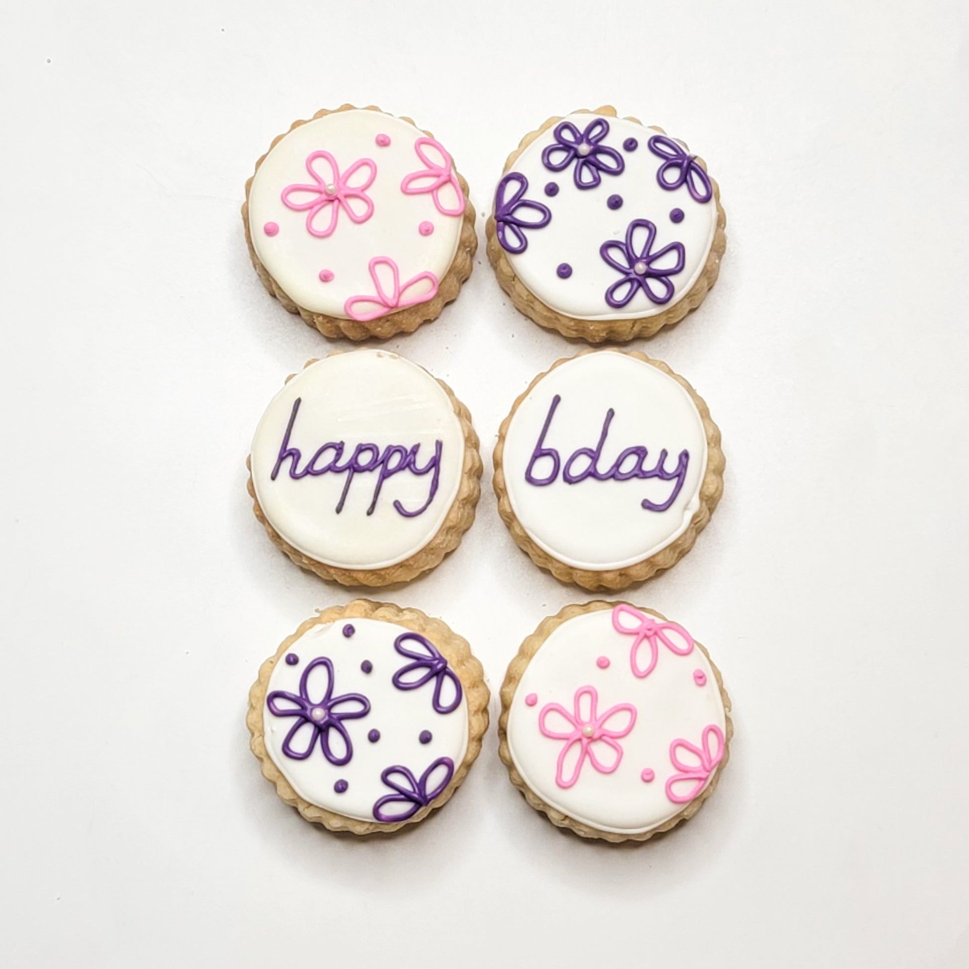 Bright white glazed shortbreads piped with our new loopy, whimsical flower design created by Kate. A great and shippable substitution for a birthday cake that many friends can enjoy!
